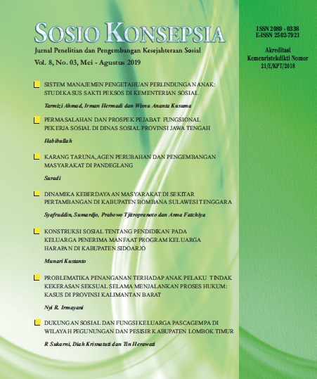 Pekerja sosial adalah pejabat fungsional yang berkedudukan sebagai pelaksana teknis fungsional yang menyelenggarakan kegiatan pelayanan kesejahteraan sosial pada instansi pemerintah maupun badan/organisasi sosial lainnya. Banyaknya pejabat fungsional di Dinas Sosial Provinsi Jawa Tengah tidak terlepas dari banyaknya Panti sosial sebagai Unit Pelaksana Teknis Daerah (UPTD) yang dikelola oleh Dinas Sosial Provinsi Jawa Tengah. Tujuan penelitian ini adalah mendeskripsikan masalah dan prospek pekerja sosial fungsional di Dinas Sosial Provinsi Jawa Tengah. Hasil penelitian menunjukan penempatan sebagian besar fungsional pekerja sosial di panti sosial milik Pemerintah Provinsi Jawa Tengah sudah tepat karena fungsional pekerja sosial dapat mengimplementasikan pengetahuan dan keterampilannya pada pemberian layanan langsung kepada penerima manfaat.. Fungsional pekerja sosial terampil ditempatkan di panti sosial namun yang menjadi permasalahannya kualitas pekerja sosial terampil mengalami kejenuhan/monoton dalam tugas yang sama, sehingga etos kerja menurun. Kualifikasi pendidikan berasal dari program studi ilmu kesejahteraan sosial/pekerjaan sosial untuk formasi CPNSD fungsional pekerja sosial, seringkali tidak dipatuhi oleh Pemerintah Daerah. Tunjangan jabatan fungsional pekerja sosial maka penghasilan tambahan yang diterima oleh fungsional pekerja sosial sangat kecil dan tidak sebanding dengan resiko yang dihadapi. Berdasarkan hasil penelitian ini maka disarankan untuk mengurangi kejenuhan fungsional pekerja sosial untuk memutasi jabatan fungsional pekerja sosial di Panti Sosial ke Panti Sosial lainnya. Kementerian Sosial RI perlu mengadvokasi dan mensosialisasikan jabatan fungsional pekerja sosial serta mengusulkan kenaikan tunjangan fungsional pekerja sosial.