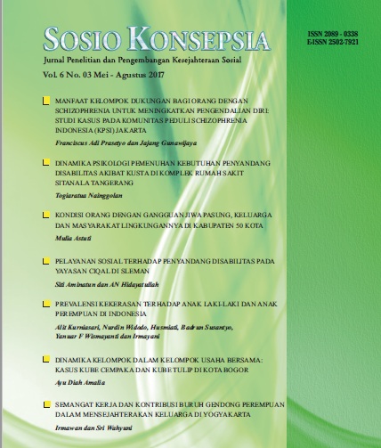 DINAMIKA PSIKOLOGIS PEMENUHAN KEBUTUHAN PENYANDANG DISABILITAS AKIBAT KUSTA DAN IMPLIKASI KESEJAHTERAAN SOSIALNYA. STUDI KASUS DI KOMPLEKS RUMAH SAKIT SITANALA TANGERANG Togiaratua Nainggolan 235-255 PDF (Indonesian)