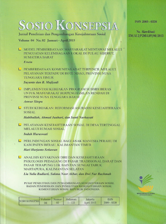 PEMBERDAYAAN KOMUNITAS ADAT TERPENCIL MELALUI PELAYANAN TERPADU DI ROTE NDAO, PROVINSI NUSA TENGGARA TIMUR Suyanto Suyanto, B Mujiyadi 15-36 PDF (Indonesian)